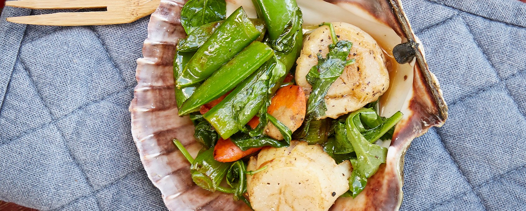 - Once the scallops are almost ready, add the rocket and spinach. Turn off the heat and let the heat of the pan cook the vegetables. Squeeze over a few drops of lemon.