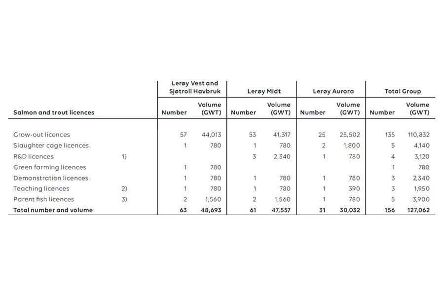 2) The teaching licences are considered time-limited with a duration of 10 years. The licences have zero purchase price, and therefore no depreciation. The teaching licence allocated to Lerøy Aurora in the table above legally belongs to Troms- og Finnmark Fylkeskommune (third party), but is operated by Lerøy Aurora. The licence allocated to Lerøy Sjøtroll legally belongs to Hordaland Fylkeskommune (third party), but is operated by Lerøy Sjøtroll.