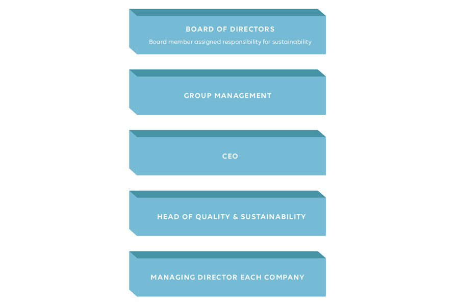 In the Group, the CEO has main responsibility for this area. The Head of ESG & Quality is responsible for coordinating work involving the environment/ sustainability for all the companies within the Group. Responsibility is delegated to the Managing Director of each subsidiary.