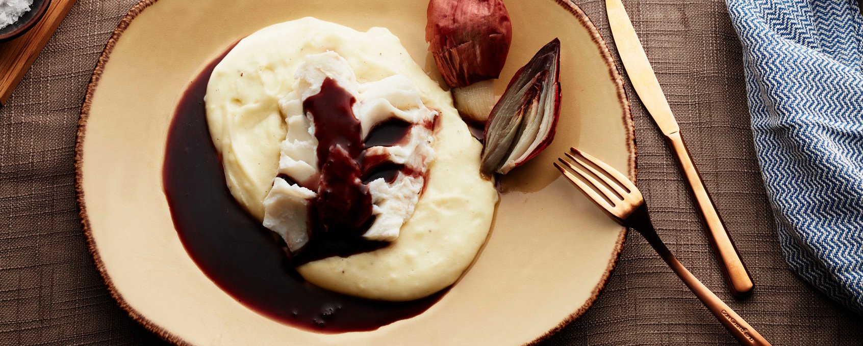 5. Serve poached cod with baked shallots, potato and garlic purée topped with the red wine sauce.