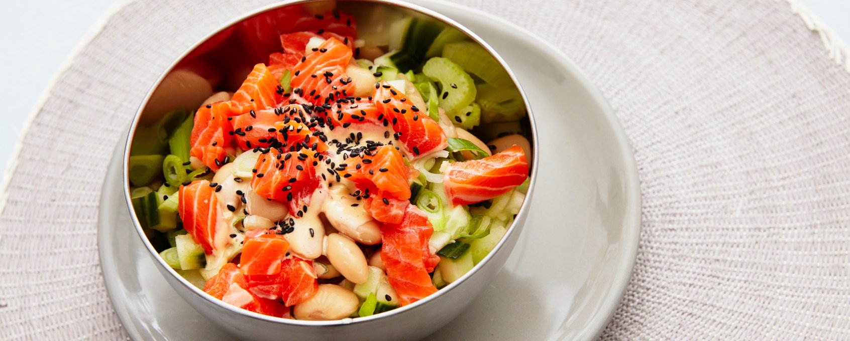 All the ingredients for this poké are available in regular grocery stores. White beans and the mayonnaise sauce make it mighty, so the poké bowl is well suited for a light dinner or lunch.