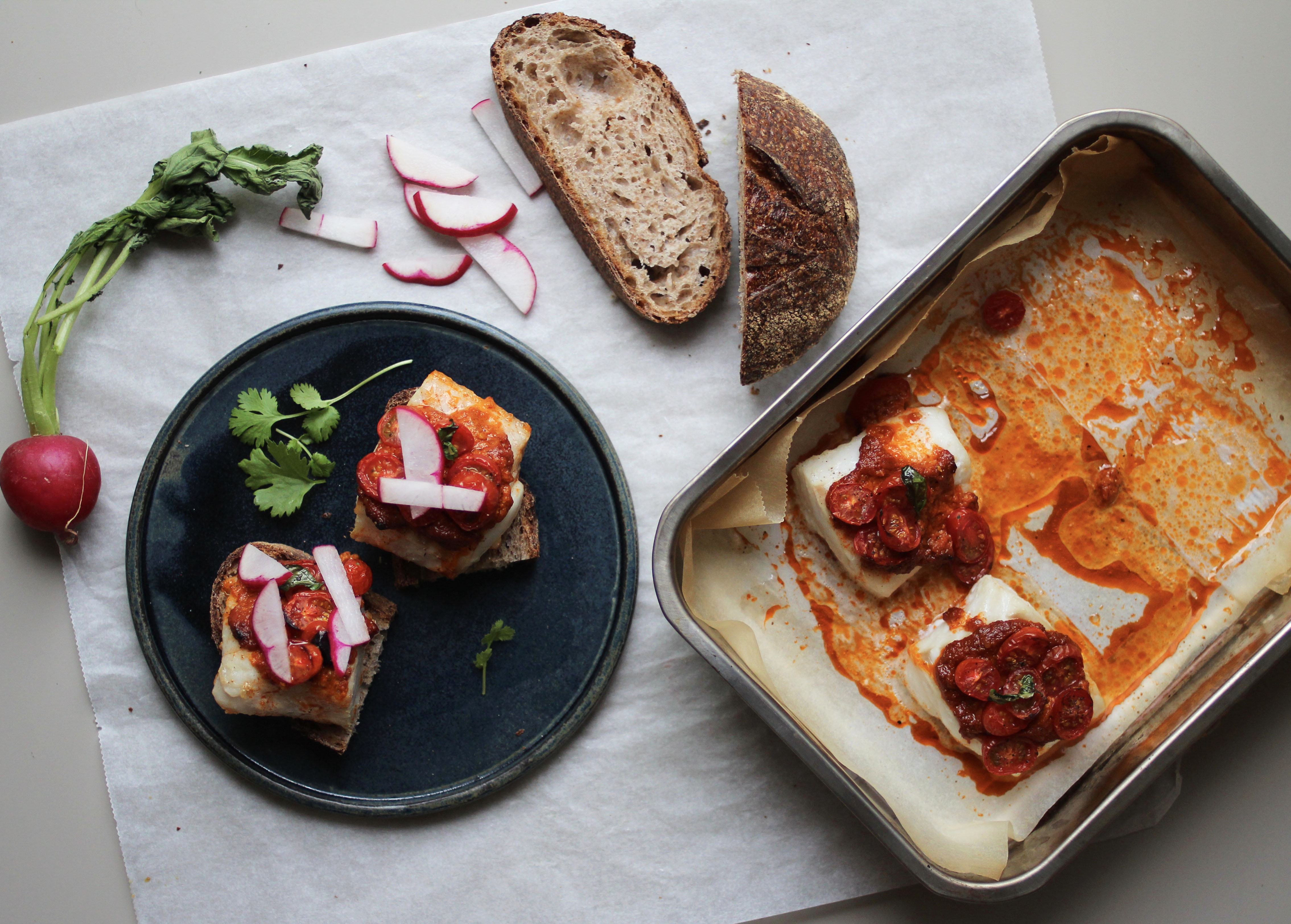 2. Ovnsbakt torsk med rød pesto og tomat er smak av luksus i all sin enkelhet. Du deler torsk i fire like store biter og topper dem med en blanding av rød pesto og cherrytomater før middagen bakes i ovnen og smakene får satt seg. Også her kan du velge mellom å servere fiskestykkene på grovbrød, eller sammen med tilbehør, som potet, pasta eller en grønn salat.