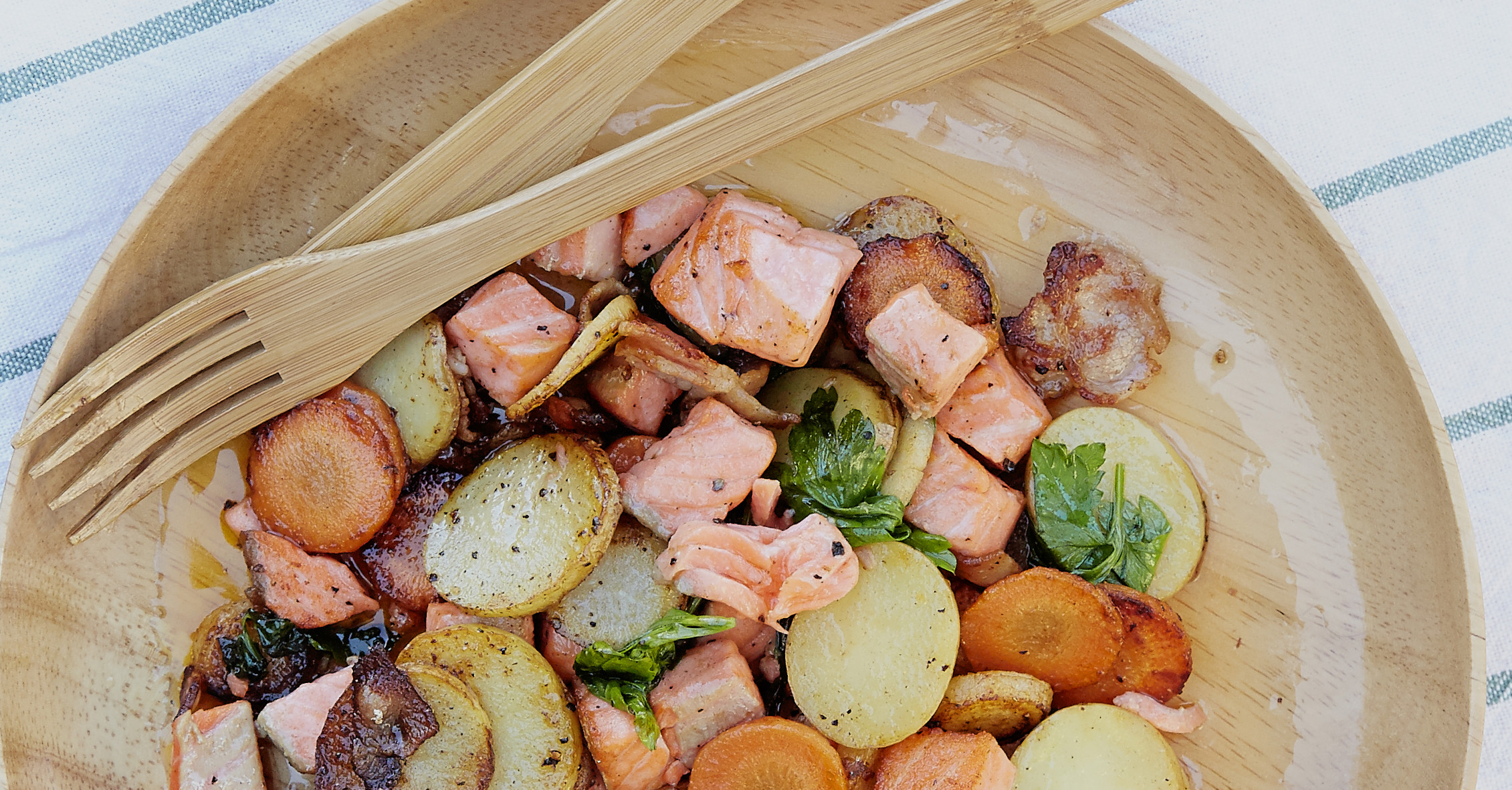 Epler kan brukes til så mangt, og gir en herlig friskhet til denne lakseretten. Foto: Øyvind Ganesh