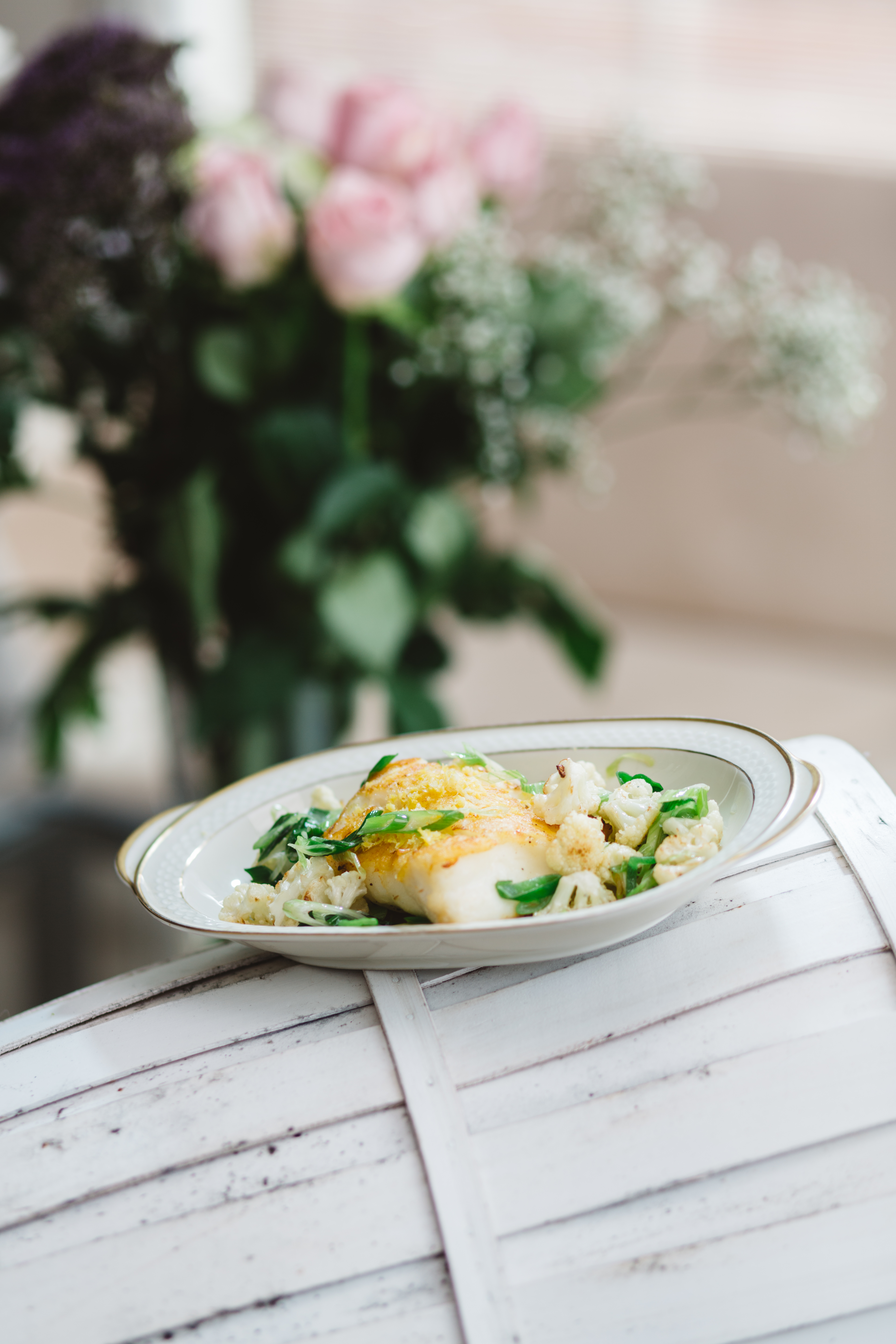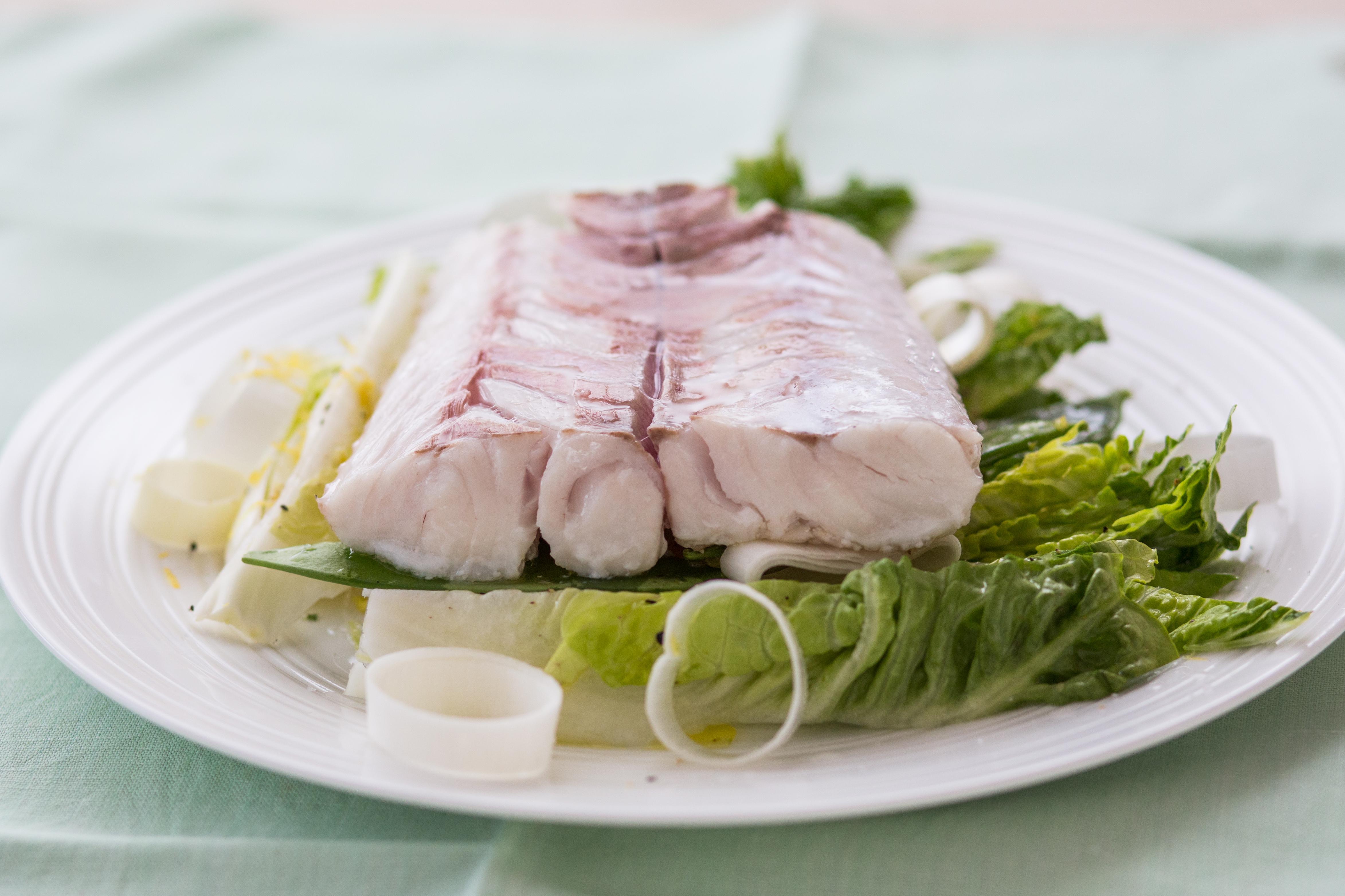- Når lysingen er ferdig bakt, børst saltet av og legg fisken med skinnsiden opp på tallerkenen. Trekk av skinnet og server.