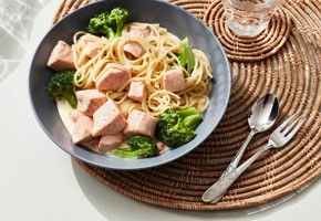 - Bland sammen soyasaus, sesamolje, sesamfrø og chilisaus, hell over lakseterningene.