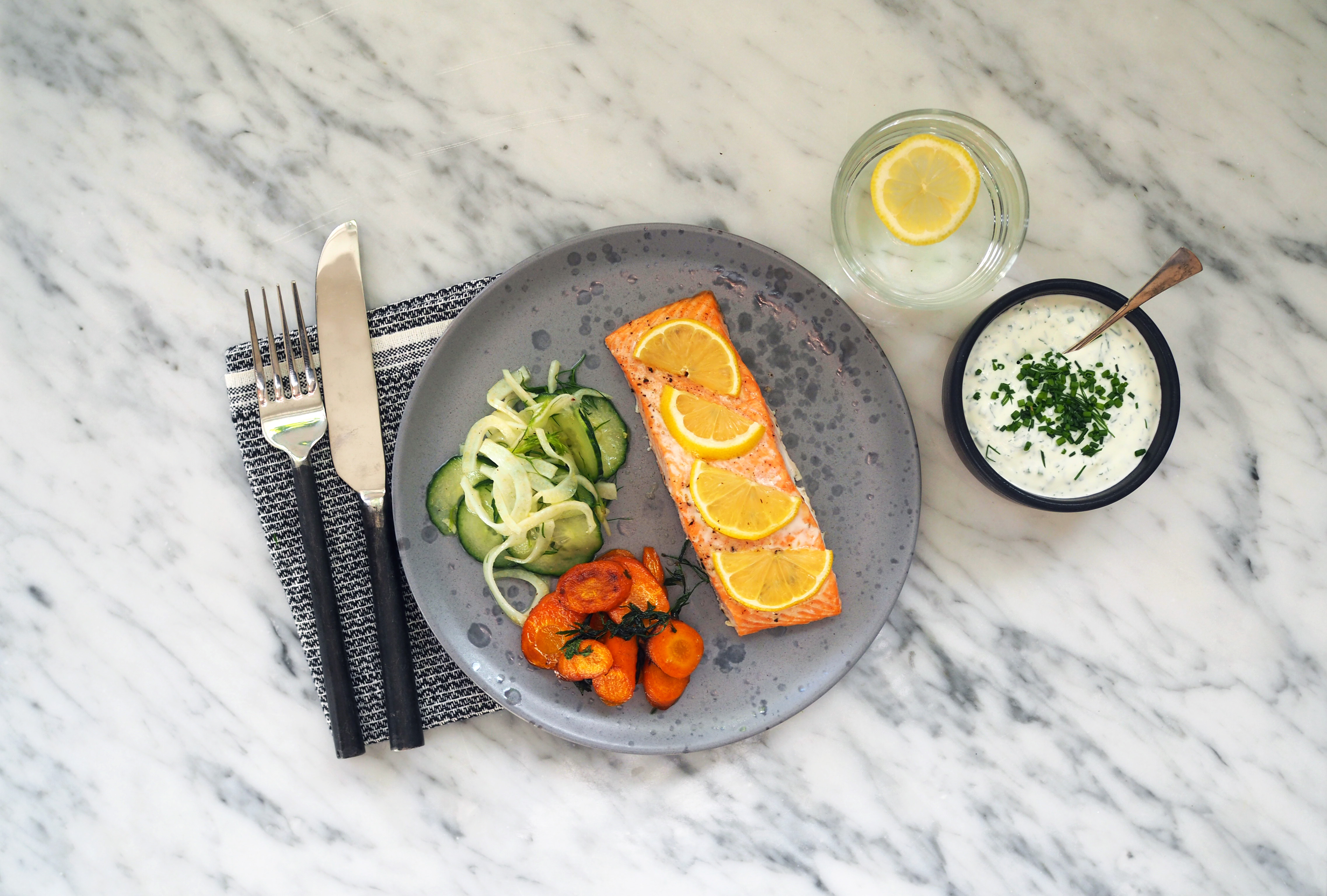 7. Server laksefiletene med smørstekte gulrøtter, agurk- og fennikelsalat og en god dæsj urterømme. med smørstekte gulrøtter, agurk- og fennikelsalat og en god dash urterømme.