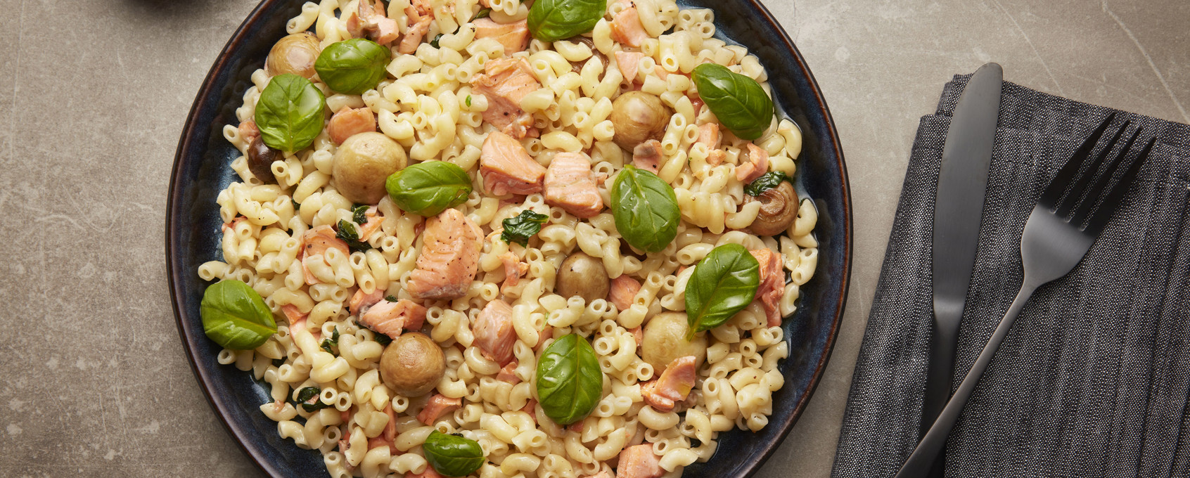 4. Server makaroni med sjampinjong, ørret og basilikum.