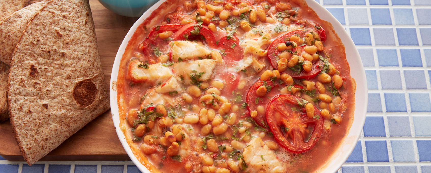 2. Skjær fisken i terninger, tomater og paprika i skiver og finhakk chilien før du blander det sammen med tomatbønner, grovhakket persille, salt og pepper i en bolle.
