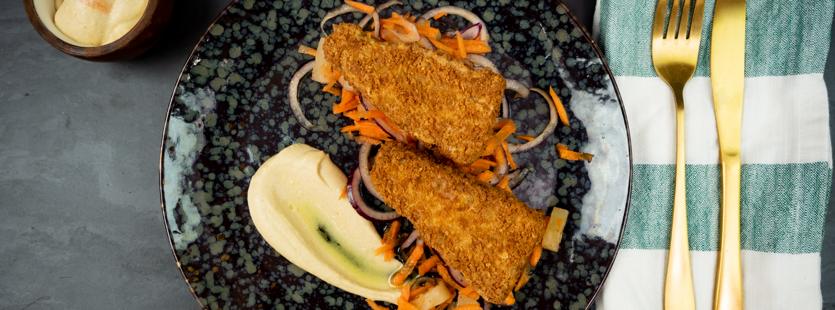 5. Server panert sei med råkost og ønsket mengde hummus.