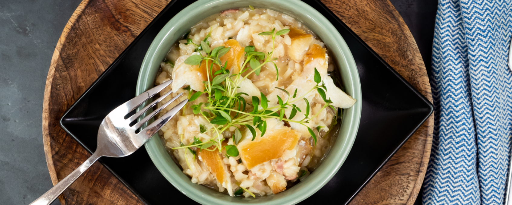 Framgangsmåte på risotto med røkt hyse, timian og bacon: