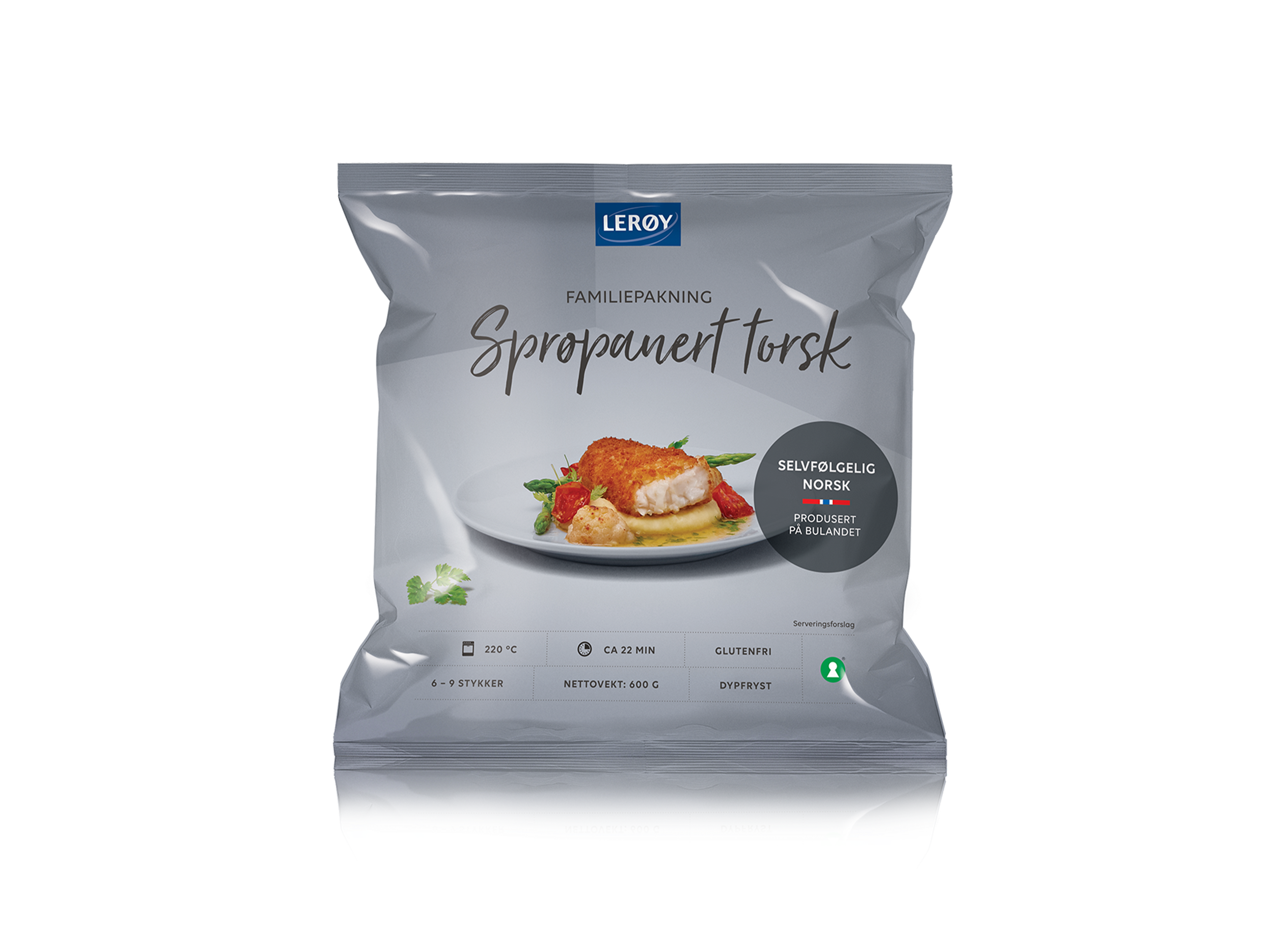2. Fjern plastfolien fra pakken med de sprøpanerte torskefiletene. Stek dem i ovnen i cirka 18 minutter, til de er gylne.