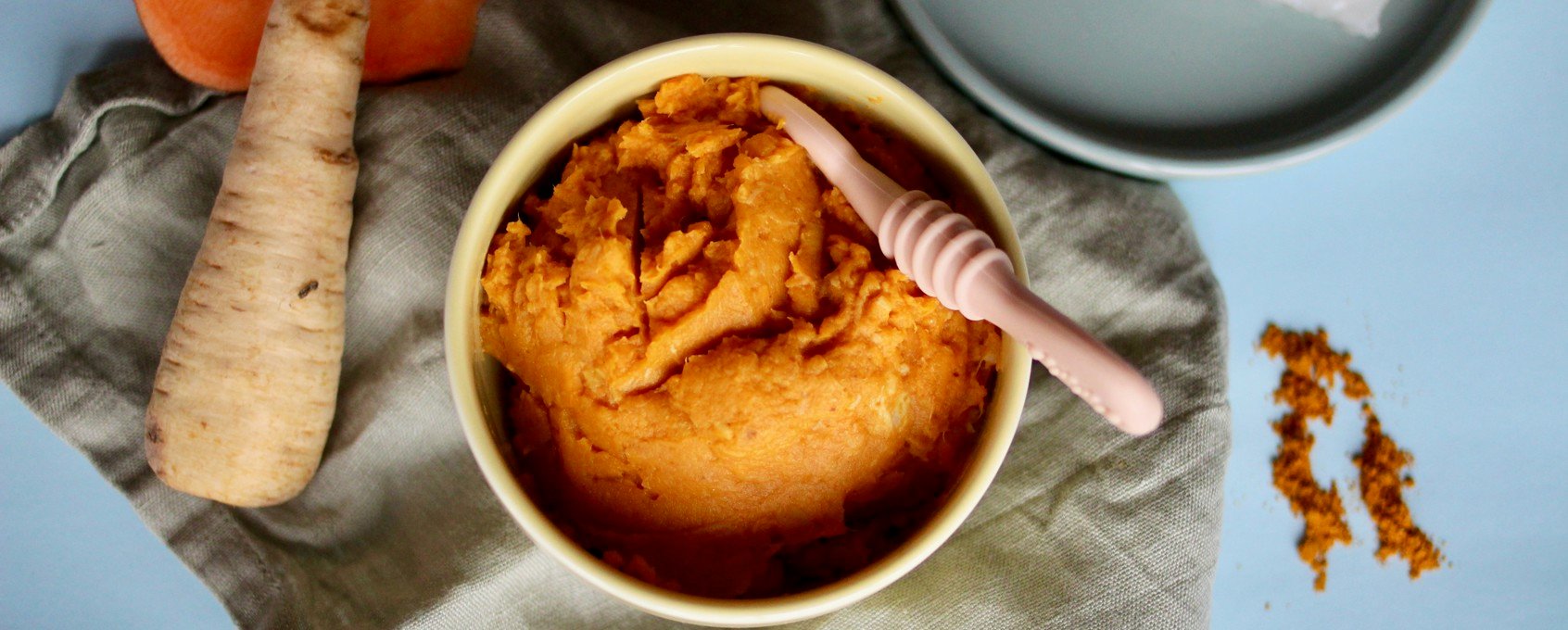 - Kjør gryta jevn med en stavmikser. Tilpass eventuelt konsistensen mer litt vann eller morsmelk/MME. Server lunken.
