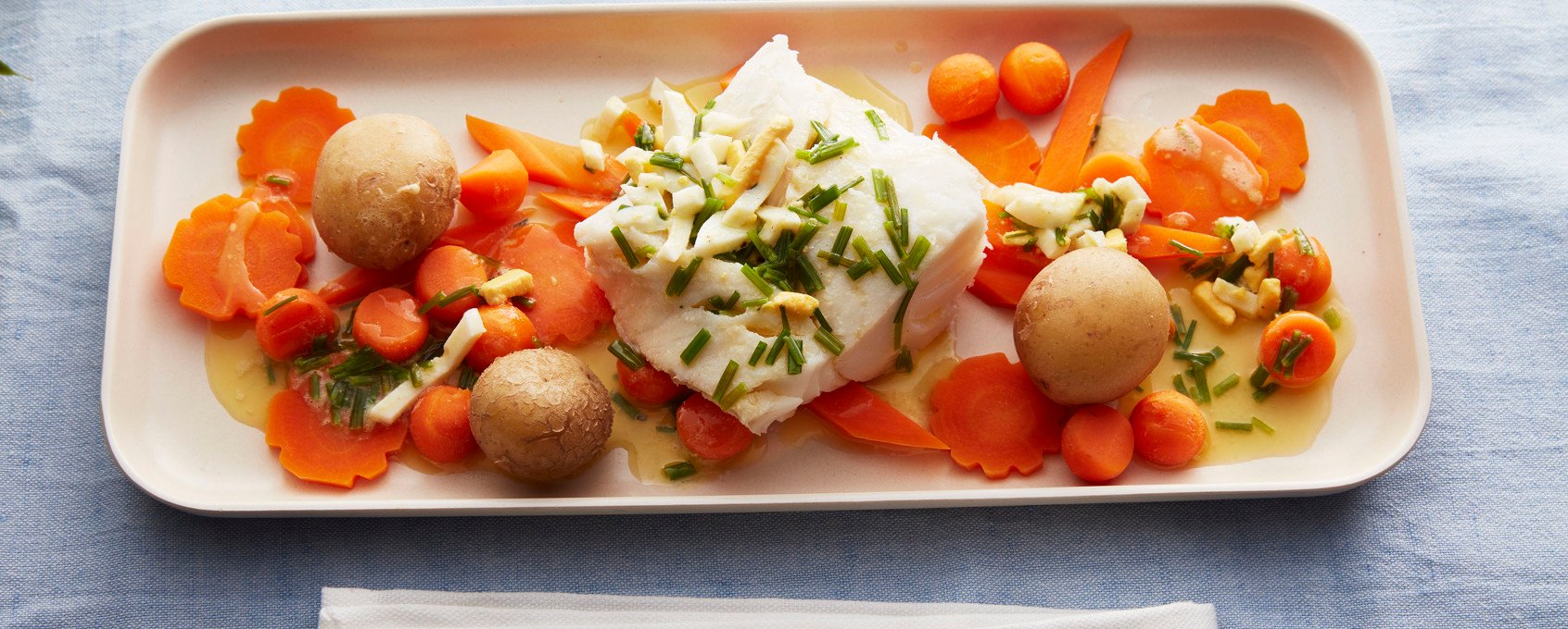 Fremgangsmåte trukket torsk med gulrot, småpoteter og eggesmør:
