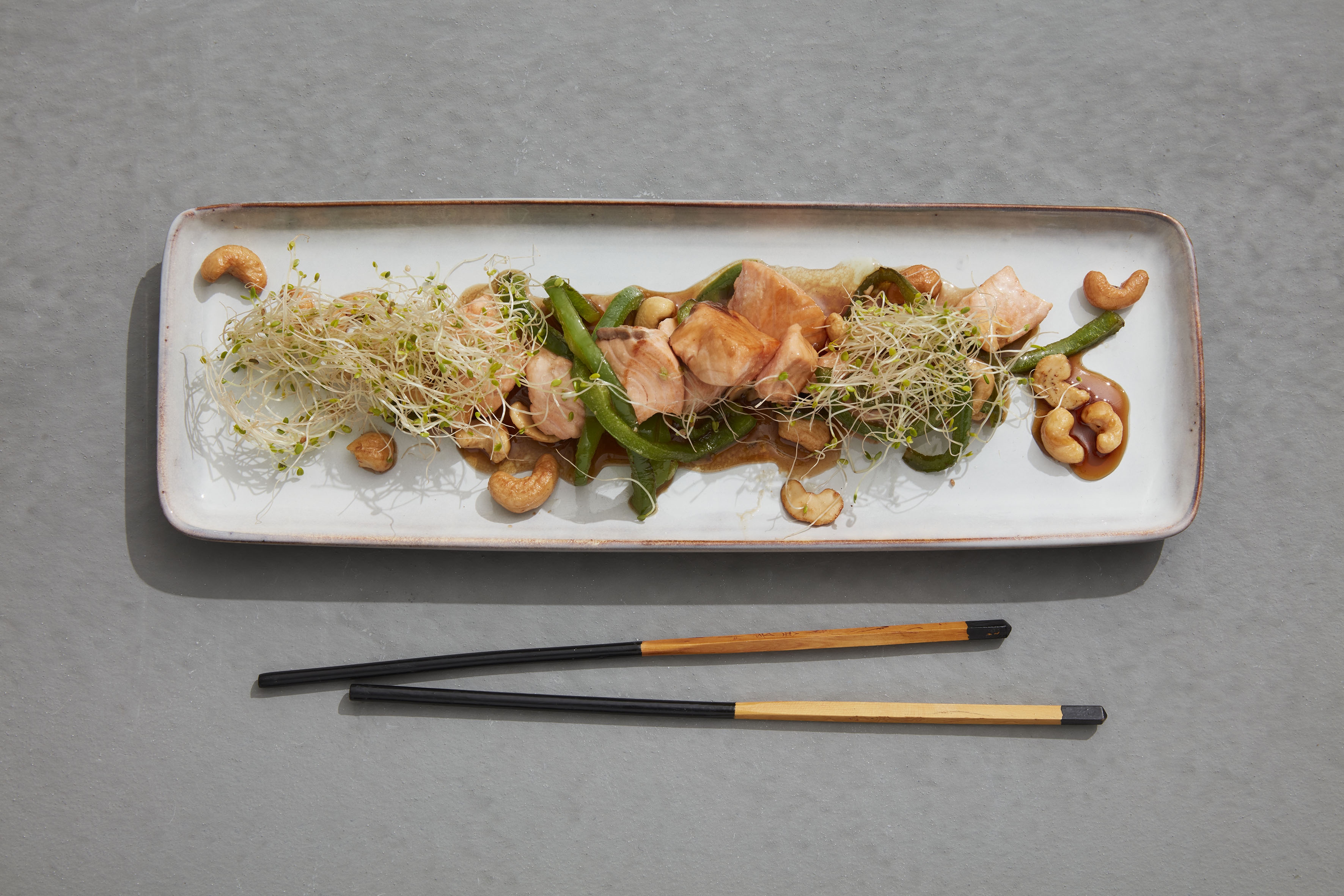 5. Server laksewok med paprika og cashewnøtter toppet med alfaspirer.
