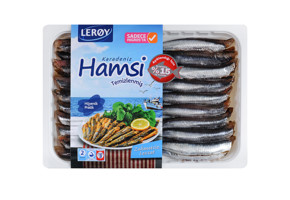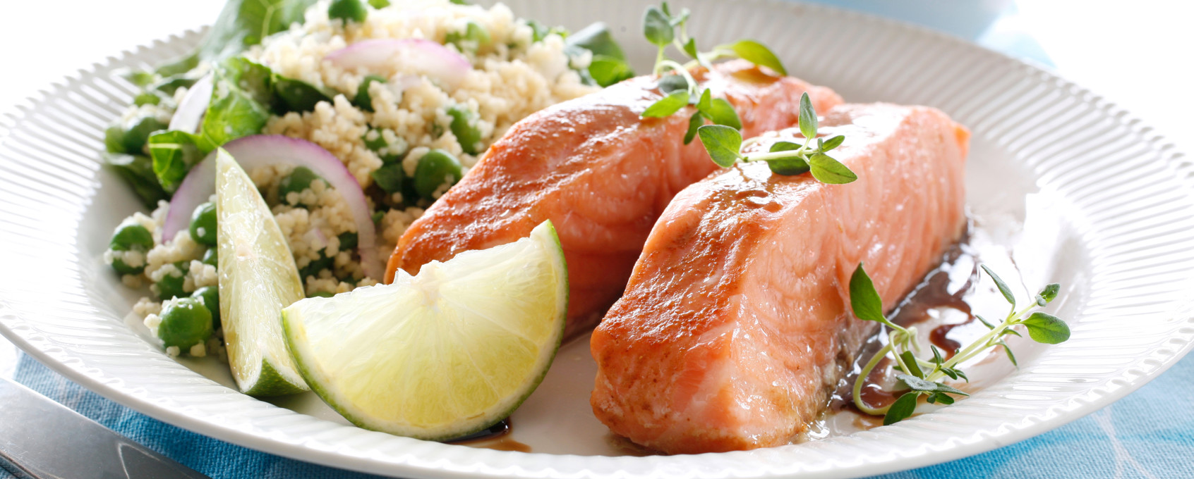 Fırında pişen somonlar kuskus salatası ve misket limon ile birlikte servis edilir.