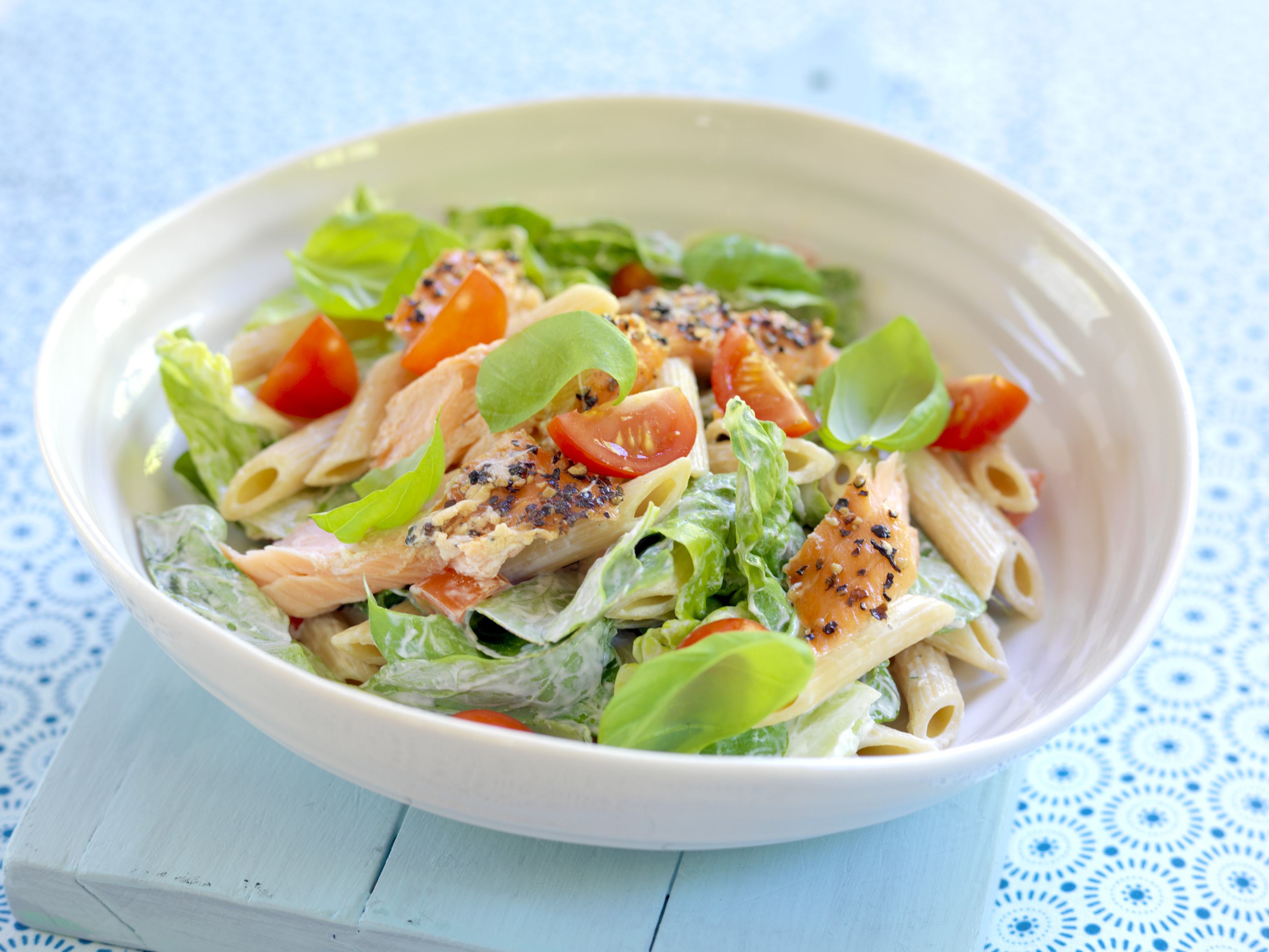 Dilimlenen çeri domates, kapya biber ve salatalıklar eklenen makarna salatasına küçük parçalara bölünen sıcak somon füme eklenir.